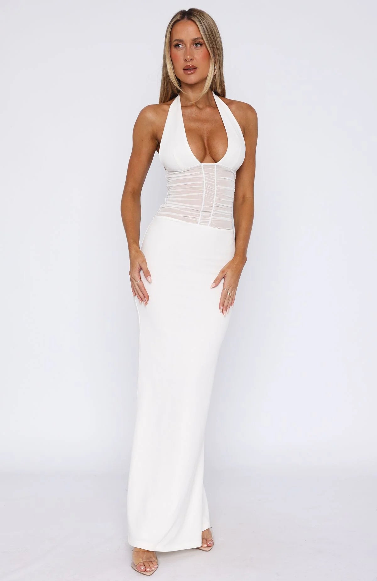Create the dreamiest look in the All My Love Maxi Dress White! Features a halter neck design with hook and loop closure, low plunge sweetheart neckline, sheer bodice with ruching detailing, maxi length, backless, back split detailing, and stretch material. Complete the look with kitten heels and gold jewellery for a fit we love!