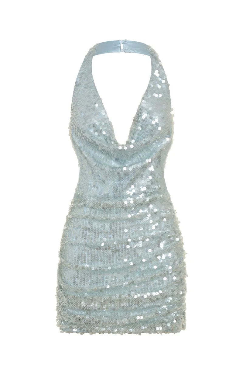 A blur of fun and sequins in the At The Function Halter Mini Dress in Mist! Features halter straps that button at the nape, a draped cowl neckline, a sleek fitted silhouette with side‑ruched detailing, dazzling sequin embellishments, a bold backless cut, an invisible side zipper plus hook and eye closure and all fully lined for smooth wear. Style with statement heels and layered gold jewellery to shine all night long.