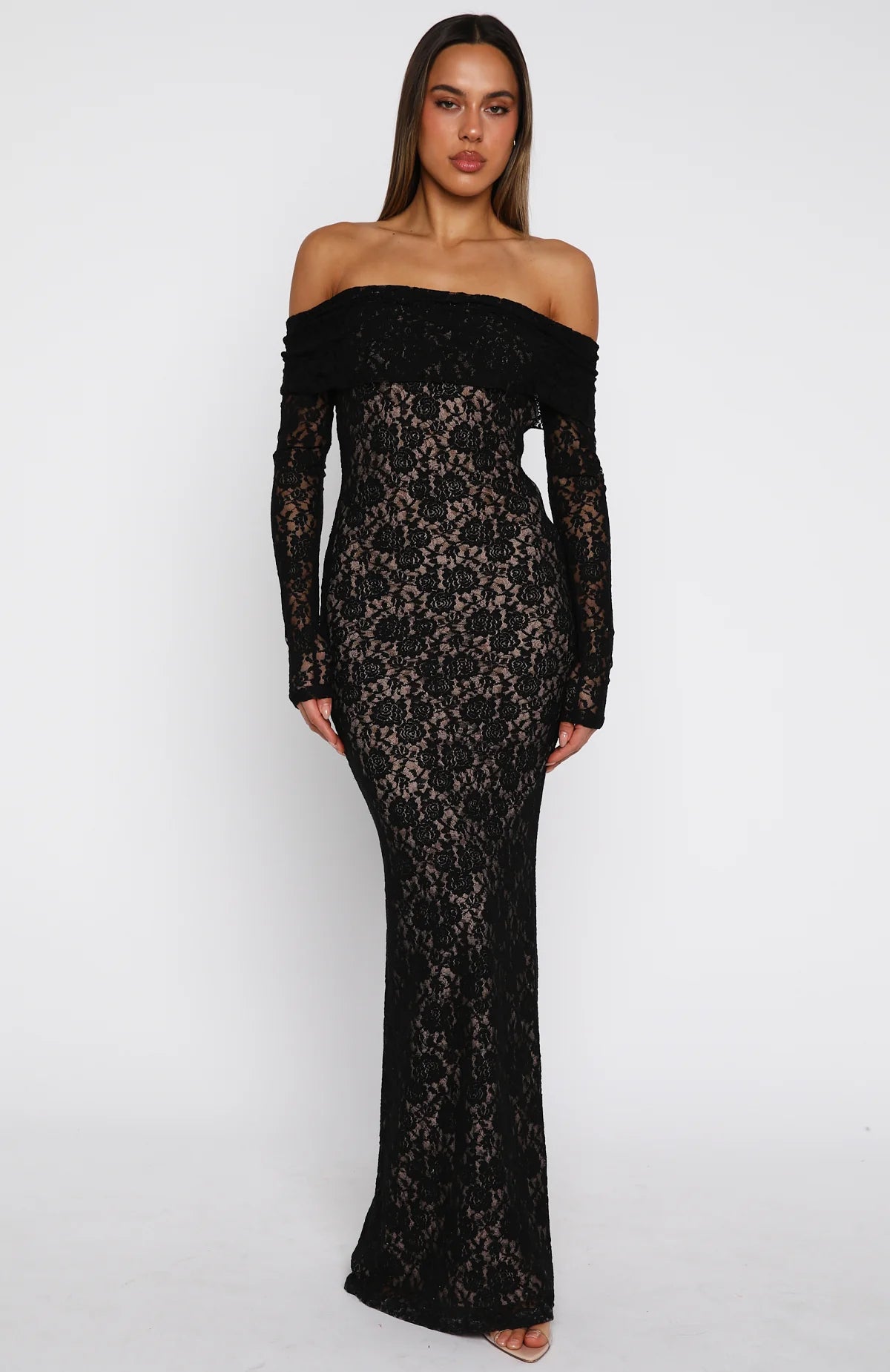 The Be My Peace Lace Long Sleeve Maxi Dress in Black has totally stolen our hearts. The off‑shoulder neckline is folded over with grip‑tape to stay in place securely, while the long lace sleeves and fully lace lined body give a sheer look. Invisible side zipper keeps the silhouette clean and sleek. Style with kitten heels and simple gold jewellery for a look that will turn heads.