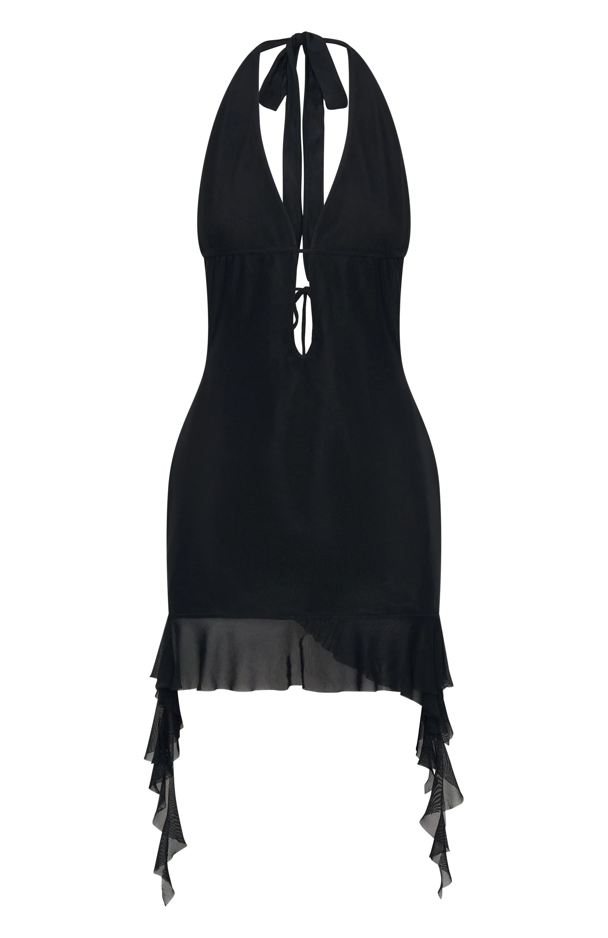 Dance through the night with the Diamond In The Rough Mini Dress Black. Features a halter neck style with self tie straps, mesh lined, semi sheer fabric, backless with adjustable tie detailing, frill drop hem, front cut out detailing and mini length. We adore this paired with a perspex heel to take your look from day to night!