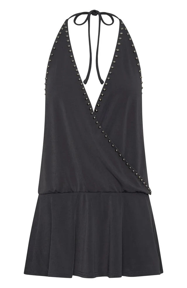 Ready to cause a commotion? The Favourite Moment Mini Dress Charcoal features a halter neck design with self tie strap, low plunge neckline, stud detailing, mini length and lined. Style with cowboy boots and silver accessories for an eye-catching look!