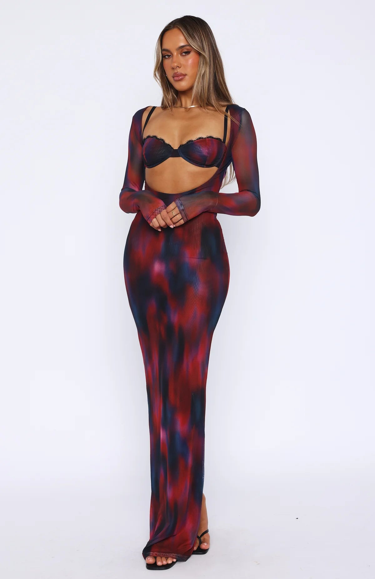 Features a plunging neckline, detachable mini-crop with bust cups and underwire with a back clasp closure and thin adjustable straps. The maxi dress features a deep cut-out design, long sleeves, split hemline design at back, mesh lined fabric, semi-sheer and slip-on design. We're in love!