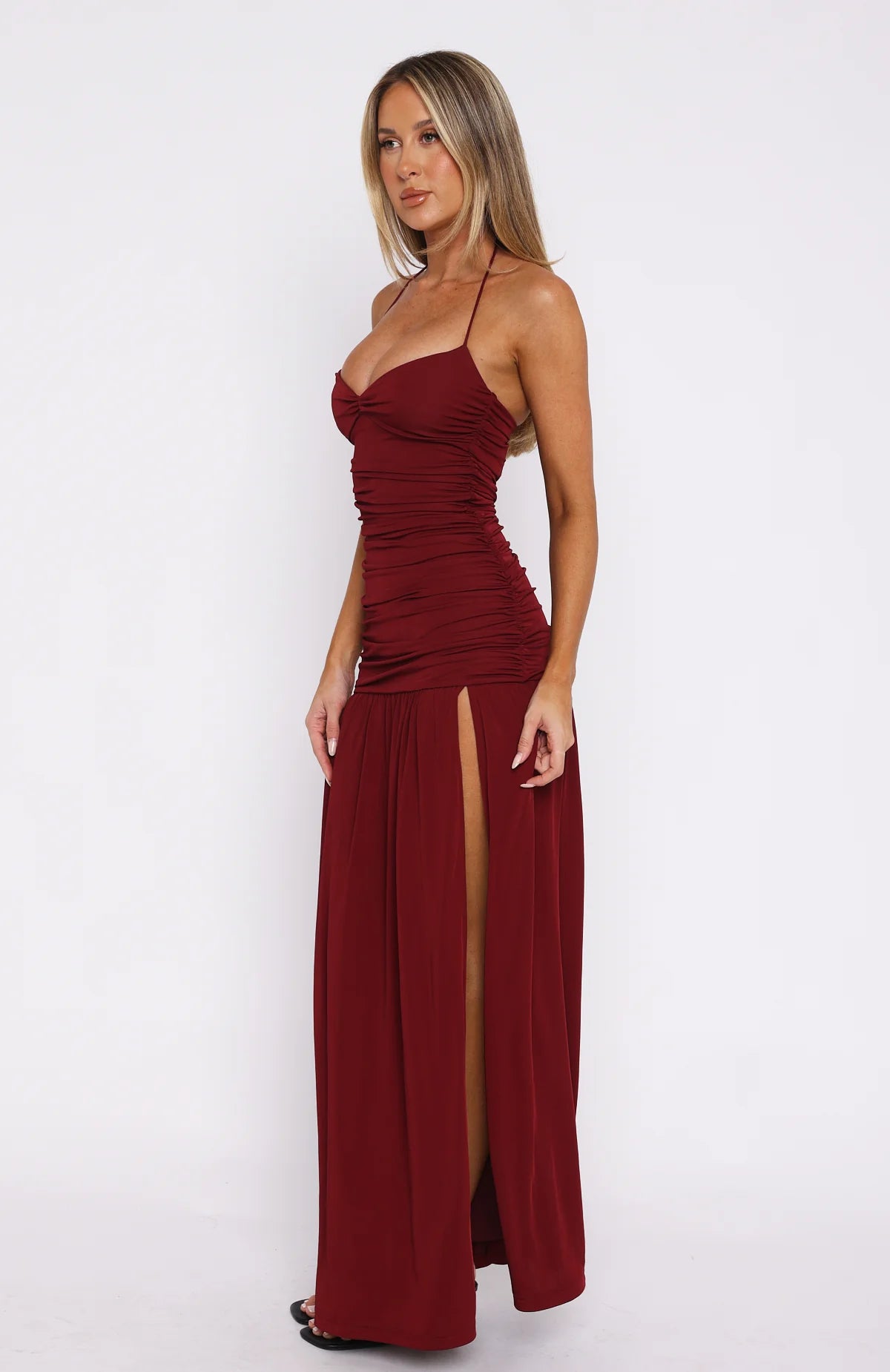 Steal all the stares in the Sweet Skies Maxi Dress Burgundy. Features a halter style neckline with thin self tie straps, ruching detail on side bodice, front side spilt, lining, stretch material for an easy slip on design and maxi length. Complete the look with simple gold accessories and a cute mini bag.