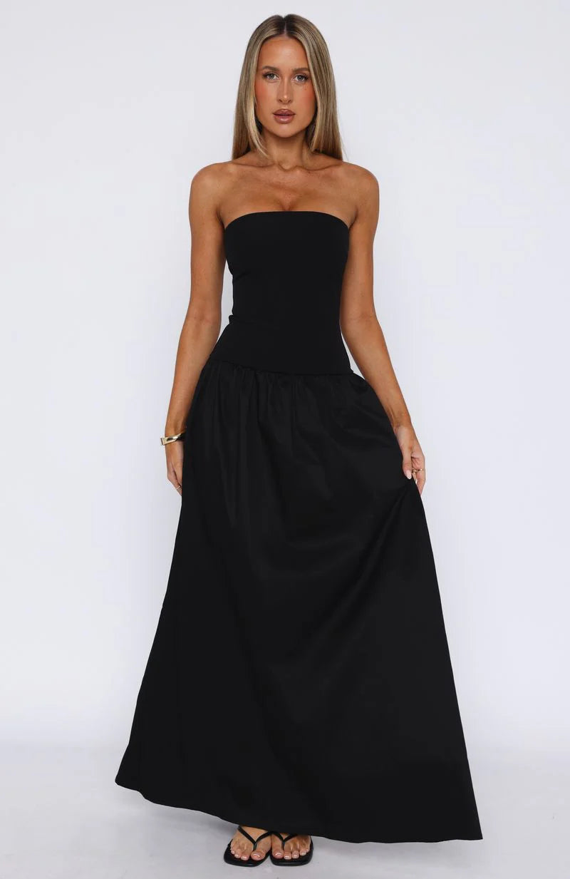 Elegant and chic. The Take Back Maxi Dress Black features a strapless design with gel grip on bust, invisible centre back zipper and closure, fitted bodice design, and gathered skirt detailing. Style with pointed toe heels and gold accessories for an old-money look!