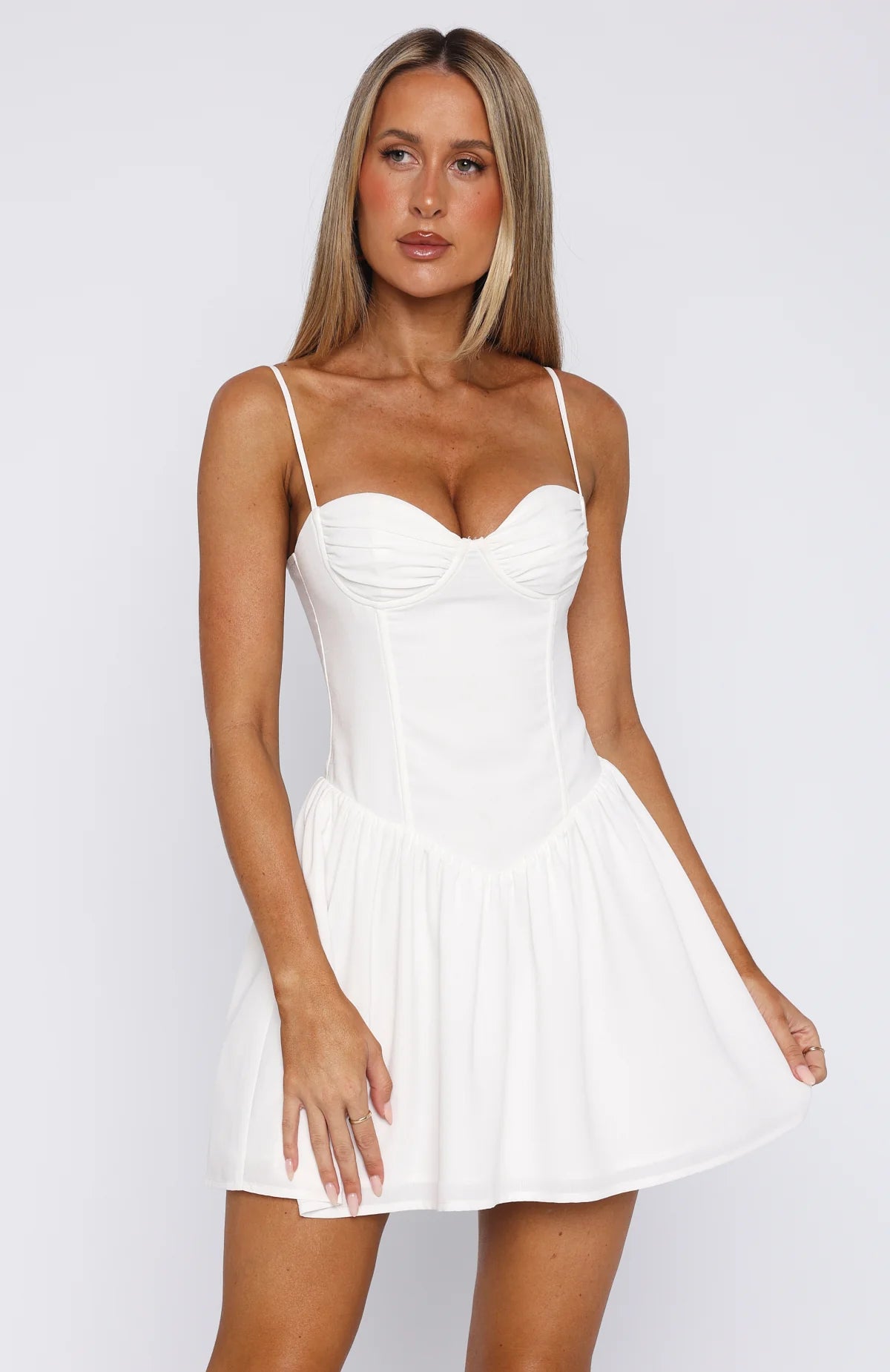 Keep it date night loving in the You're A Problem Mini Dress White! Features thin thin adjustable straps, bust cups and underwire, boning in bodice, lined fabric, hidden centre back zipper and mini length. Features gold accessories and kitten heels for a cool we love!
